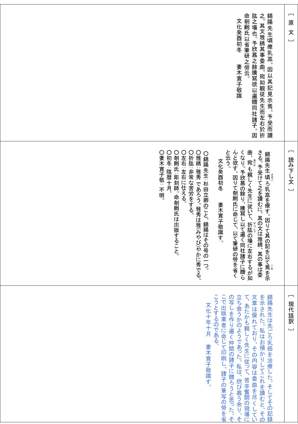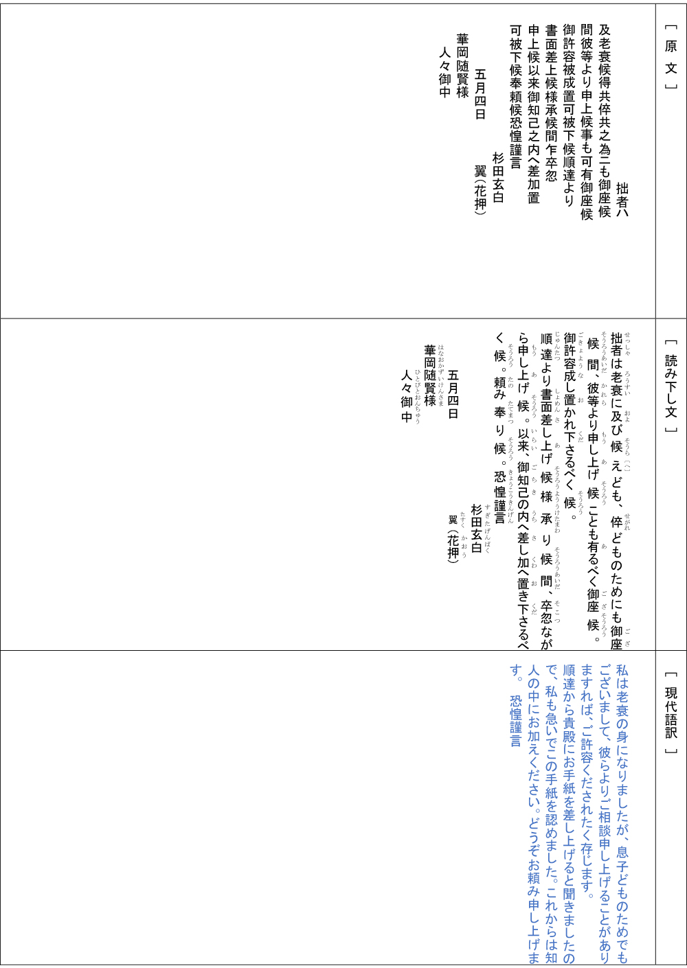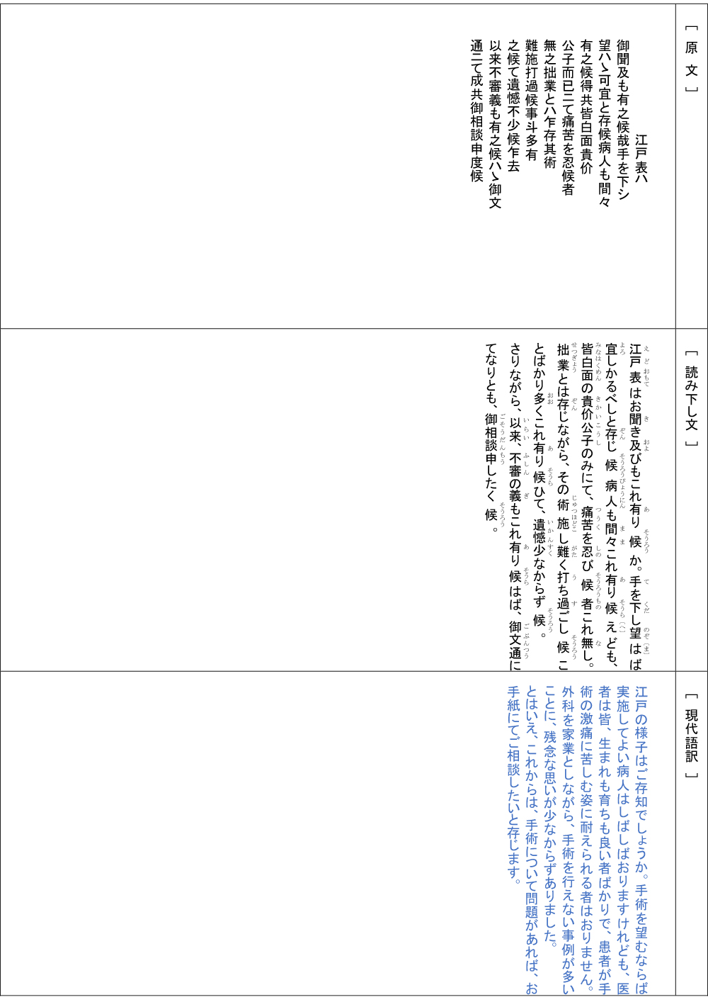 ―――しかし、以下に紹介する書誌により、これは彼の息子杉田立卿をして青洲が実施した全身麻酔の施術方法の習得、そして乳癌手術の施術を教えてもらう必要があり手紙を出したと思われます。
