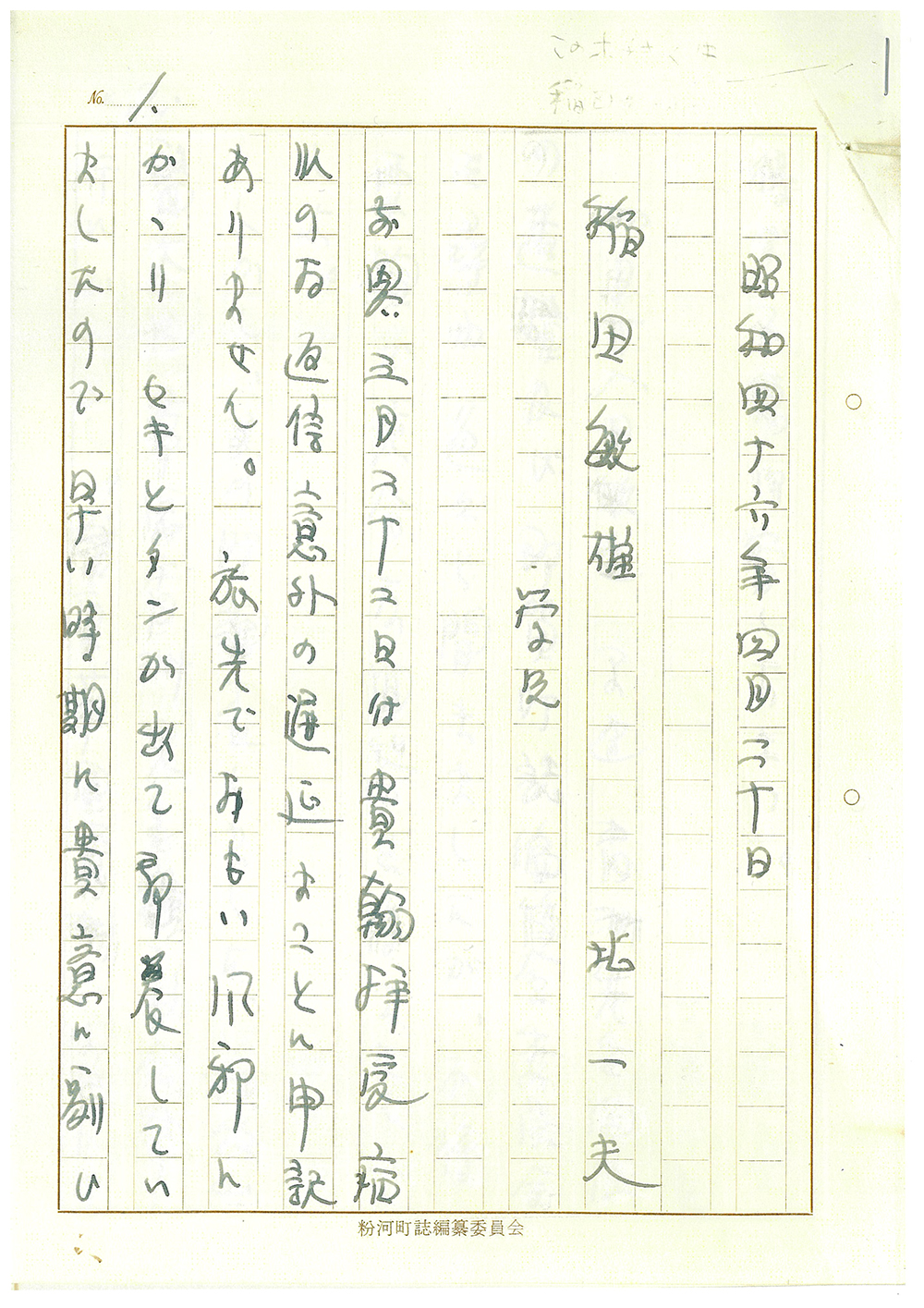 さて以上のことから間違いなく最初の発見者は青洲の史学研究に造詣が深い森本長老注5であり、一般社会に周知をした第1号のスクープは毎日新聞であることがお判りでありましょう。(内容は“世界的大ニュース”だと確信した稲田氏が奈良支局から本社に送稿したが残念ながら全国版ではなく奈良・和歌山両県の地方版扱いの記事になった為、広く周知されたとは言い難いが…。稲田氏も本稿筆者への第2信の手紙で「両県向けの結果でがっかりしました。あの時本紙〈全国版〉でもっと堂々と大見出しをつけて大きく掲載しておれば〈大スクープ〉になり医学界にも広く知られていたのに…と残念でなりませんでした。」と書いています。)注4に書簡コピー写真を載せましたが、これは本稿筆者にあてた第2信に同封されていたもので、(稲田氏が必死に探してやっと見つけたと言っていました。)2021年10月18日に到着したものです。北氏の書簡から稲田記者は昭和46年3月22日に北氏宛に手紙を書いておりますので、前述した最初の手紙の通り、3月中旬に原稿を予定稿として作成していたという稲田氏の記憶(なんと50年前の出来事の記憶!)が正しい事になります。