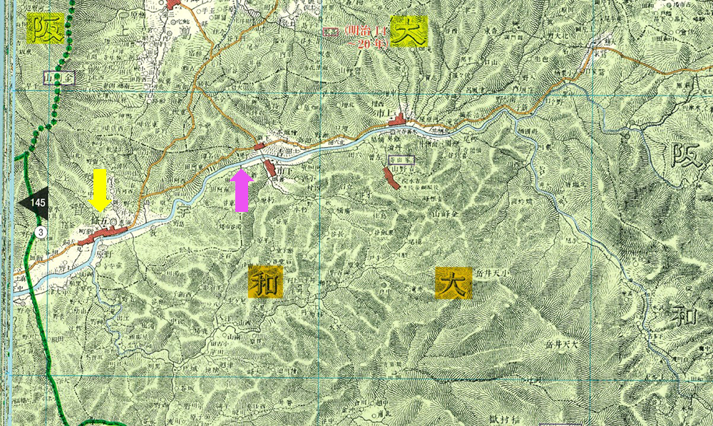 ピンク矢印:紀伊ノ川 黄色矢印:西野山