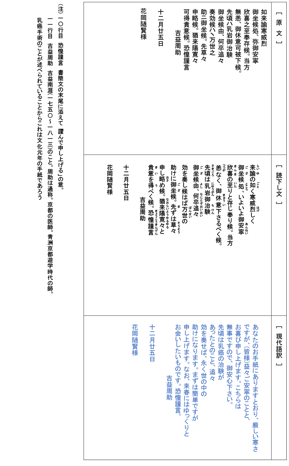 次に掲げるように青洲は手紙にて初めての乳がん手術を報告したり、病人に対して漢方の教えを請うたりしております。