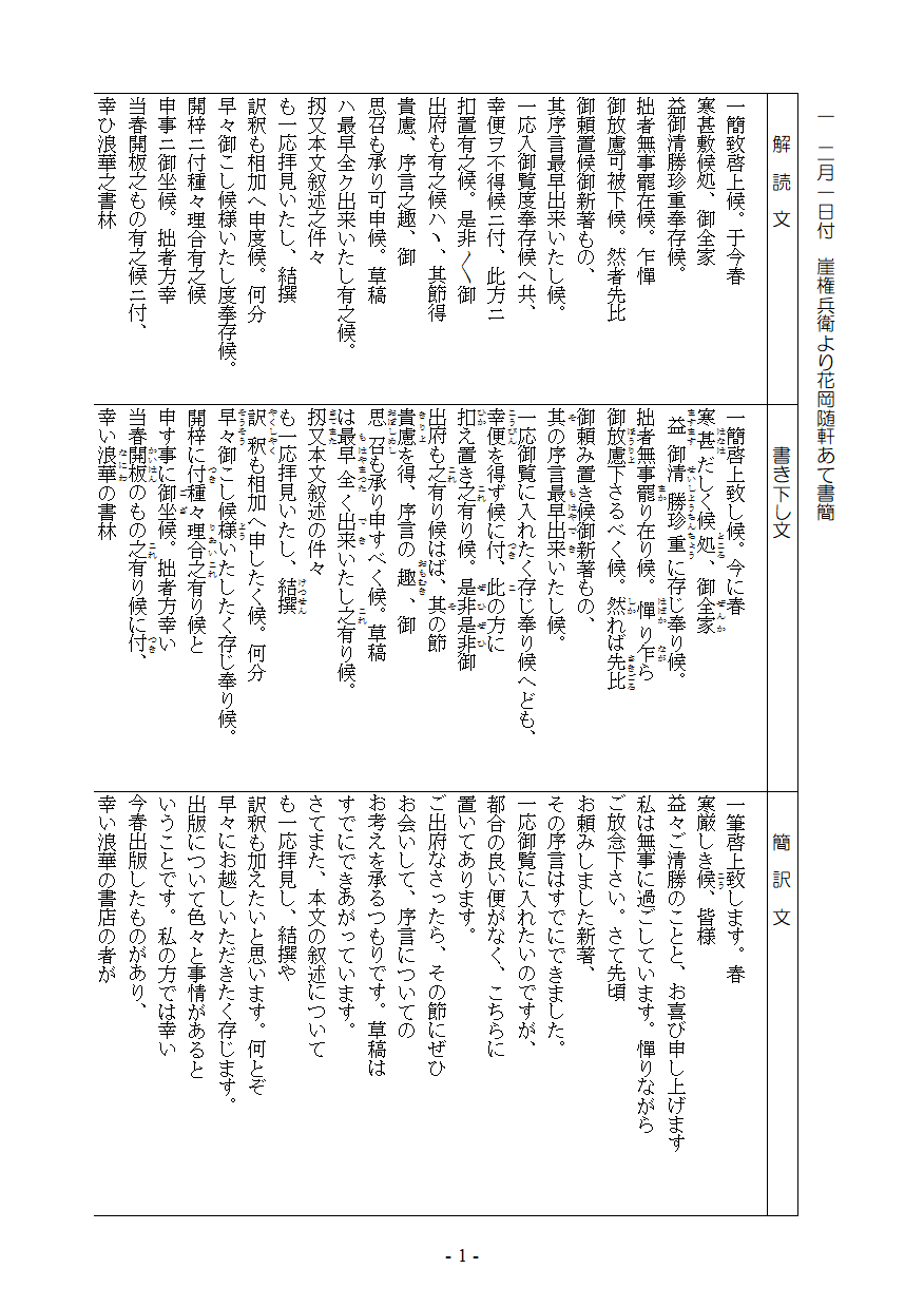 出版するかどうか青洲が悩んでいて、若い時の京都遊学時からの先輩医師・儒学者である朝倉荊山に手紙で相談し、その後の彼からの返信手紙です。