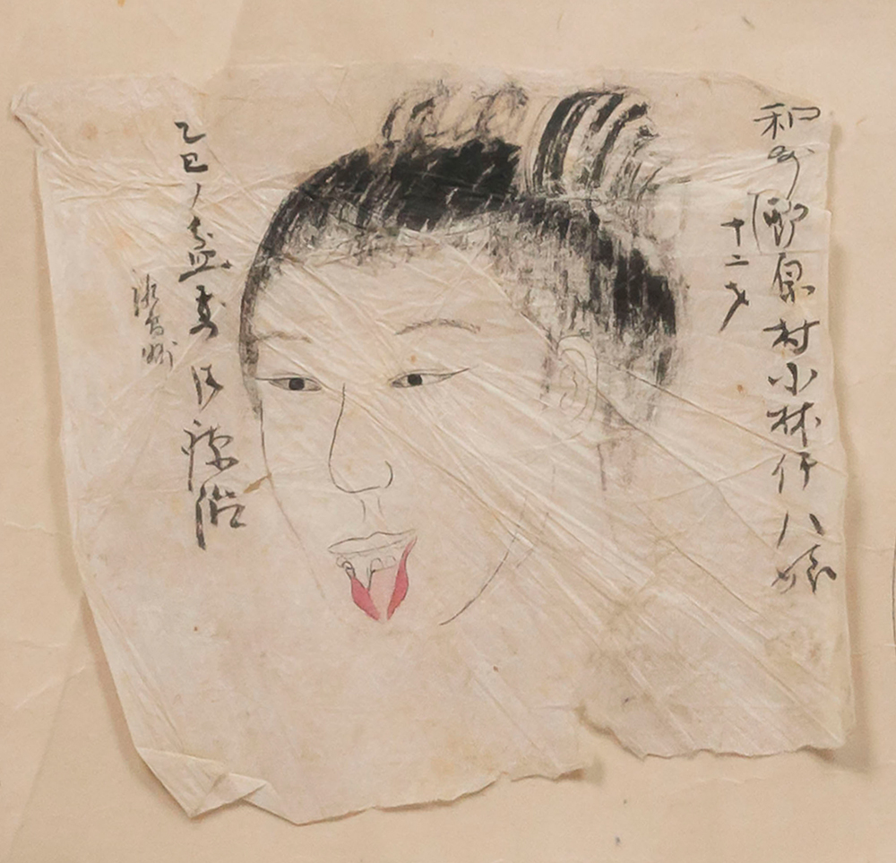 更に絵巻の中に張り紙で “和州野原村小林伊八娘十二才 乙巳の盆前に治療 鷺洲” という症例があり(画像2)