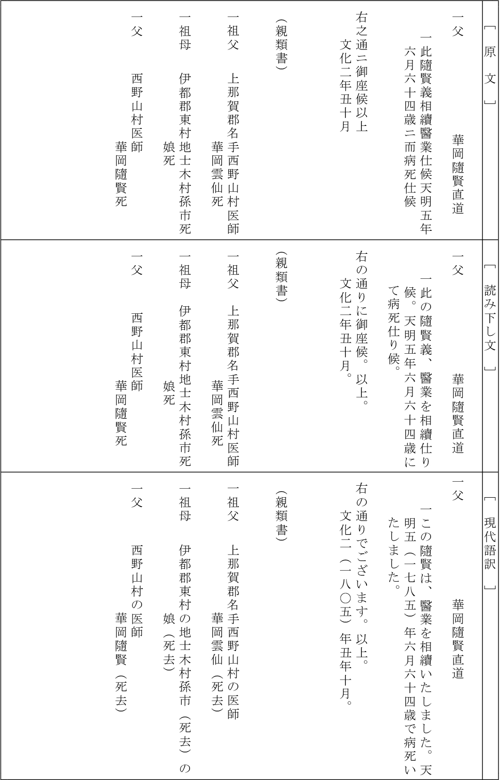 この先祖書にて青洲の履歴を確認し、士分に取立て、帯刀を許可したものと推察できます。注A