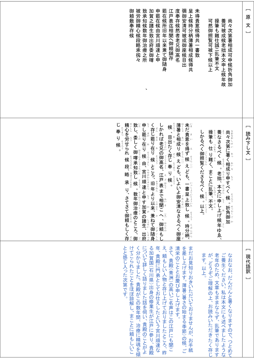 恐らく宮河は自身の免状の内容を杉田玄白に伝え、青洲の弟子ではない杉田立卿に教えて良いものか青洲に手紙で上申し許可を得る算段をしていたところ、そのことを知った玄白が礼儀の為、先に青洲に手紙を書いたものと思われます。