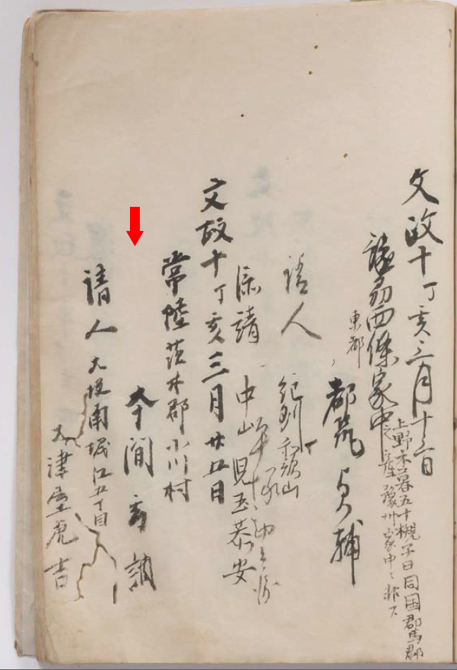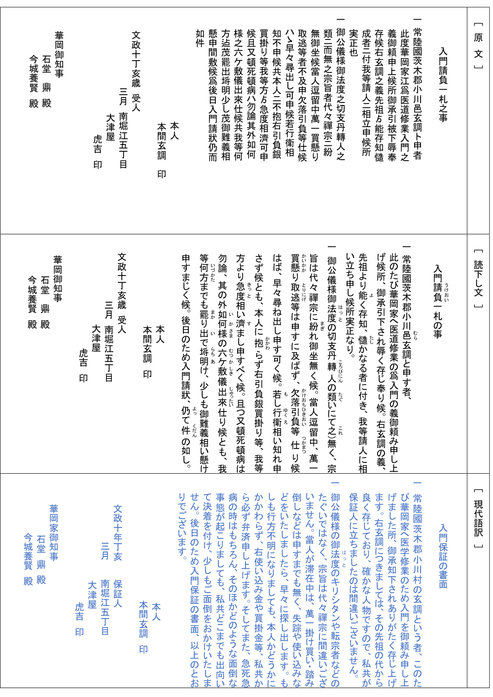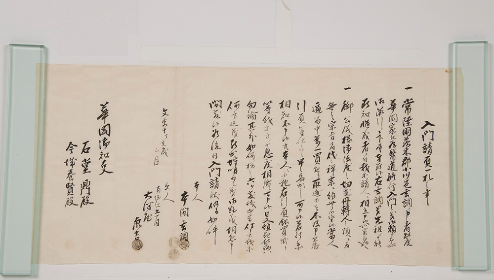 のちに水戸藩医となる本間玄調(文化元年1804年~明治5年1872年)は常陸国小川村の出身で文政10年1827年3月25日に入門しています。注1この時本間は24歳で、青洲は68歳でした。本間玄調の入門時の請書が本家にありますので写真と訳文を記します。