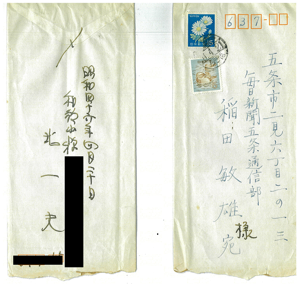 さて以上のことから間違いなく最初の発見者は青洲の史学研究に造詣が深い森本長老注5であり、一般社会に周知をした第1号のスクープは毎日新聞であることがお判りでありましょう。(内容は“世界的大ニュース”だと確信した稲田氏が奈良支局から本社に送稿したが残念ながら全国版ではなく奈良・和歌山両県の地方版扱いの記事になった為、広く周知されたとは言い難いが…。稲田氏も本稿筆者への第2信の手紙で「両県向けの結果でがっかりしました。あの時本紙〈全国版〉でもっと堂々と大見出しをつけて大きく掲載しておれば〈大スクープ〉になり医学界にも広く知られていたのに…と残念でなりませんでした。」と書いています。)注4に書簡コピー写真を載せましたが、これは本稿筆者にあてた第2信に同封されていたもので、(稲田氏が必死に探してやっと見つけたと言っていました。)2021年10月18日に到着したものです。北氏の書簡から稲田記者は昭和46年3月22日に北氏宛に手紙を書いておりますので、前述した最初の手紙の通り、3月中旬に原稿を予定稿として作成していたという稲田氏の記憶(なんと50年前の出来事の記憶!)が正しい事になります。