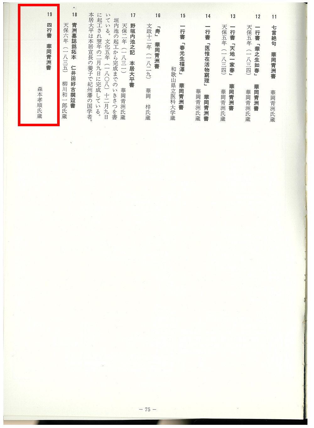 和歌山市立博物館‘92秋季特別展『近世日本医学と華岡青洲』図録(平成4年10月24日発行)で青洲の4行詩の書を森本孝順師が所蔵していることを記している。