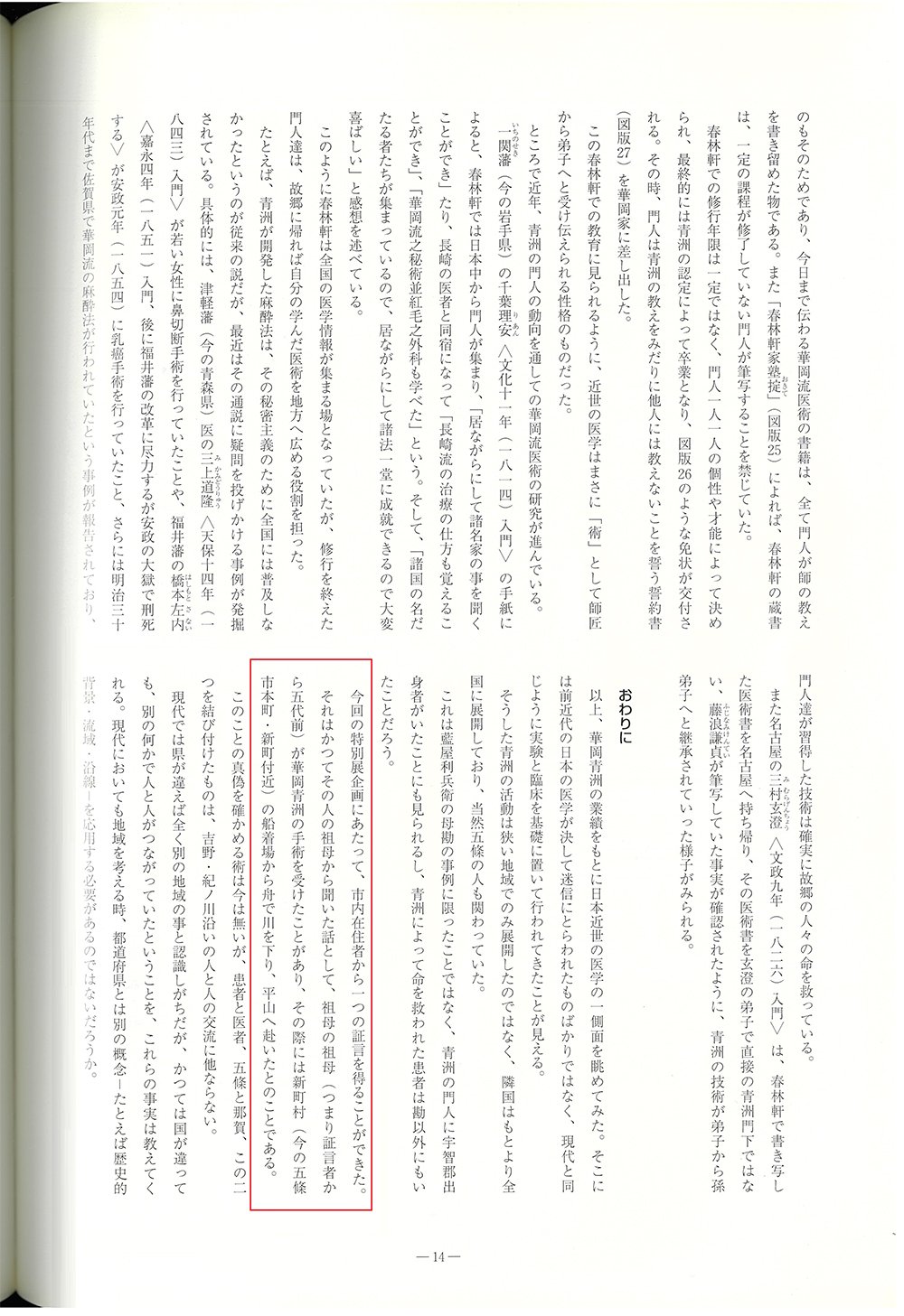 『今回の特別展企画にあたって、市内在住者から1つの証言を得ることができた。それはかつてその人の祖母から聞いた話として、祖母の祖母(つまり証言者から5代前)が華岡青洲の手術を受けたことがあり、その際には新町村(今の五條市本町・新町付近)の船着き場から船で川を下り、平山(筆者注:華岡医塾の春林軒所在地)へ赴いたとの事である。』