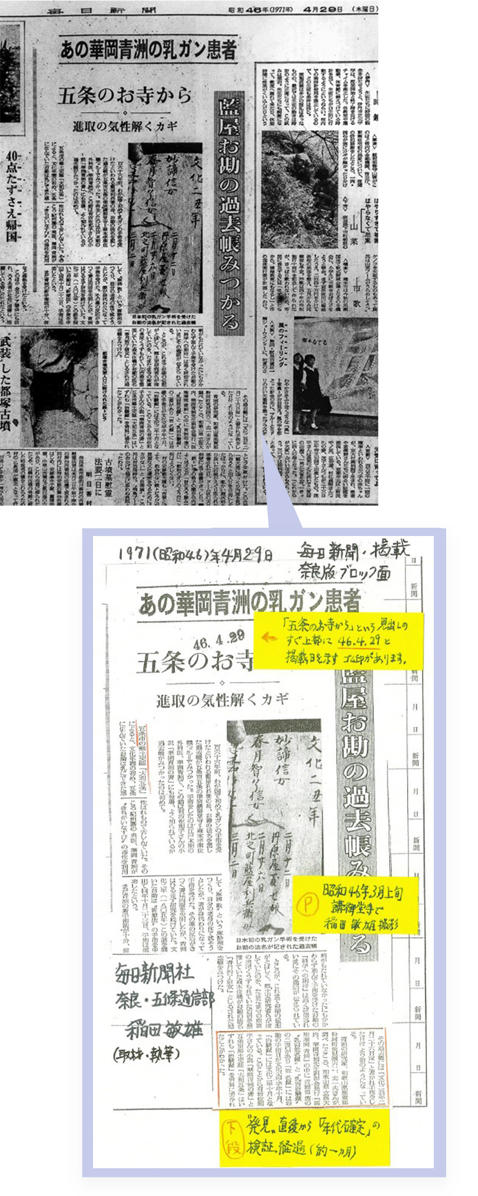 「庫裏の古文書類を整理していたら、奥のほうに眠っていたのだ。」と判り易く説明、ご教示を下さいました。話し終えると、森本長老は「だが、年代がこれまで文献で伝えられてきたのと、手術年代に差異がある。疑問が多いので、歴史専門家に検証してもらうべきだ。その結果、正しい年代の確定が出るまで新聞報道は控えるように。」とかなり厳しい口調でおっしゃいました。稲田はこの時の森本長老のご心境を「過去帳が正しい」と確信していると思いました。稲田は同長老の直言に従い田中五條市長を通じて和歌山県粉河町の郷土史家北一夫氏に年代検証を依頼し、北氏から『過去帳の命日』が正しいと回答を得たので最初の判定通りの記事を報道しました。(その時の北氏からの回答書簡は稲田が保存している。)注4結局3月中旬に出来上がった原稿の掲載が1ケ月余り遅れました。