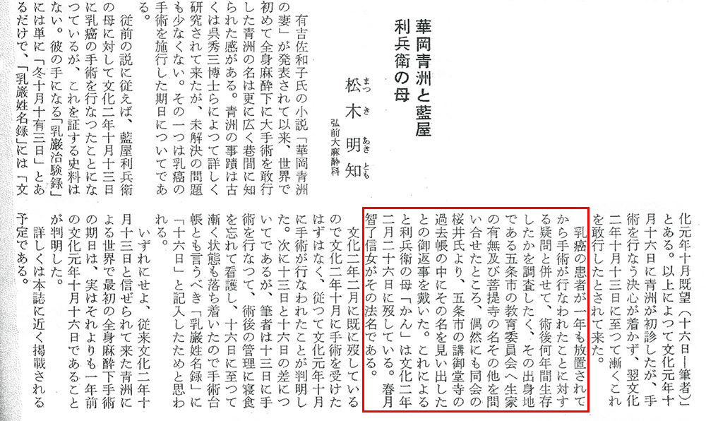 日本医史学雑誌第19巻2号昭和48年6月発行(昭和48年4月10日受付)誌上での松木氏の《華岡青洲による最初の全身麻酔の期日について》と題する論文で記述