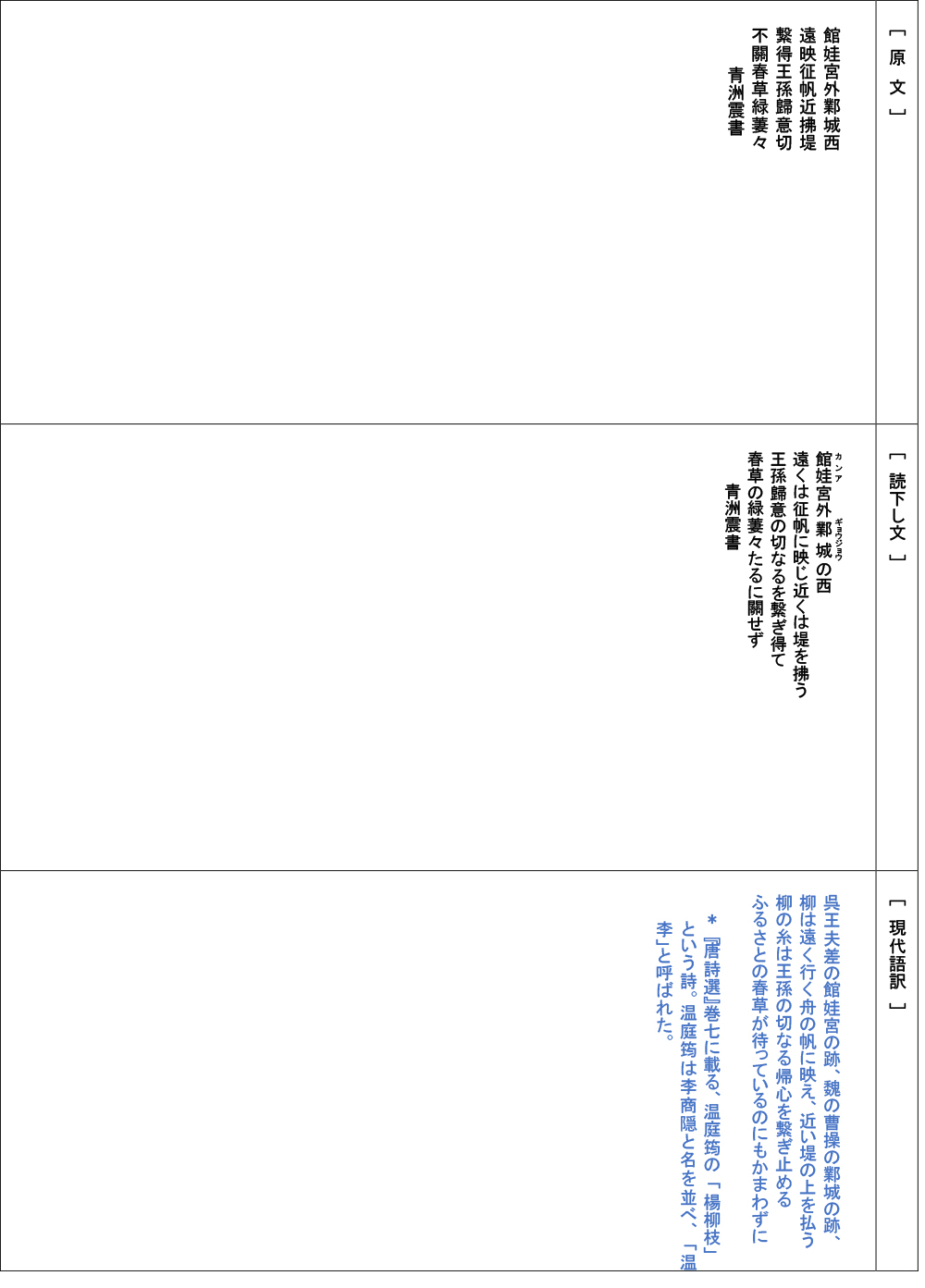 史書(史記等)、子書(老子・荘子等)、集書(唐詩選・三体詩等)にわたっており、自作の詩句も若干使われている。