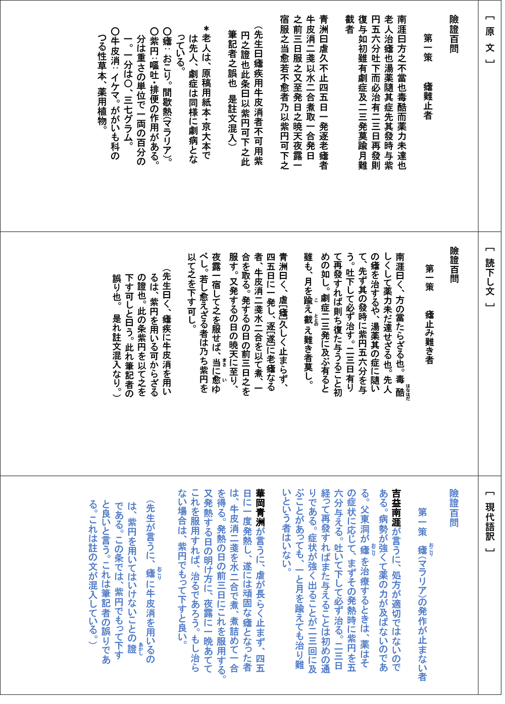 これは前回《青洲逍遥 第16回》で紹介した中川脩亭(春林軒門人録に天明8年1788年に入門記載があり。)が原著作者であり、春林軒の後、寛政5年1793年に門下に入った京都の吉益南涯及び華岡青洲の両名に病人の症状とその処方について100の質問をし、双方が回答したものです。