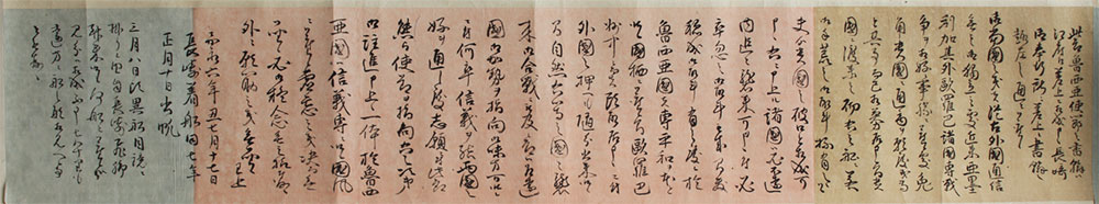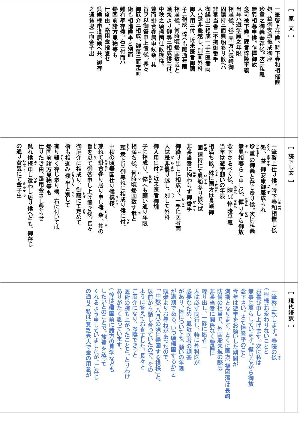 この手紙からは外様大名の黒田藩主の福岡藩が長崎(幕府直轄領)の防備を担当していることが解り興味深い。長崎近隣は江戸時代以前に切支丹大名で有名だった大村藩や江戸時代の切支丹一揆が勃発した島原藩などで江戸幕府としては外様大名のほうが信用できたのでしょう。(同じく外様大名の鍋島藩主の佐賀藩と1年交代であったようです。)