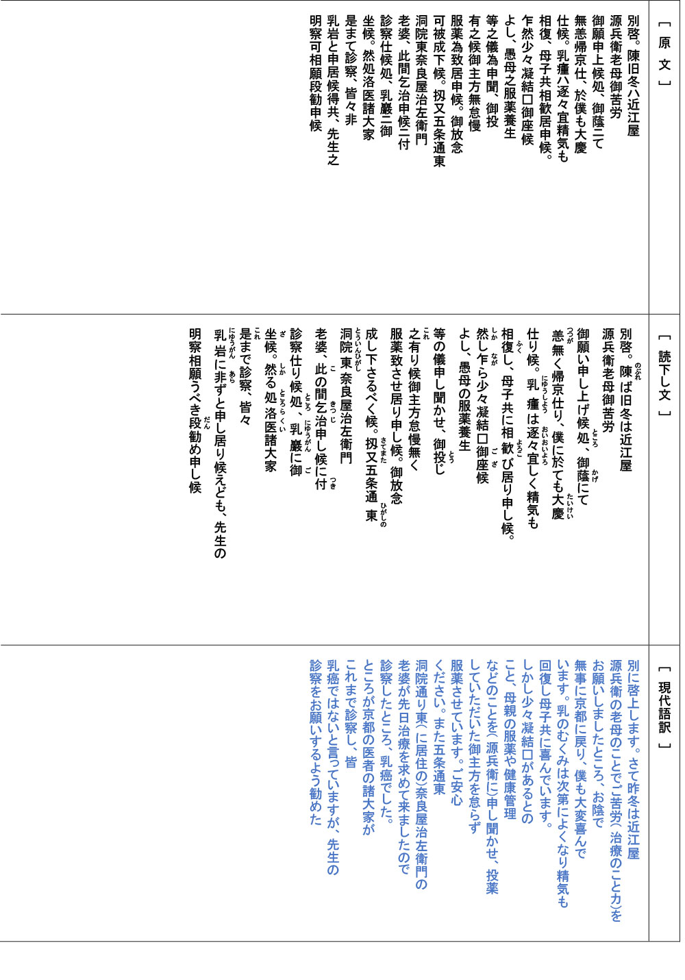 よってこの書簡の発出年月日は文政3年正月16日と判明した。またもう1人の紹介患者の奈良屋治左衛門母は同じく文政3年正月21日と迅速に青洲の治療に来ていることがわかる。しかしこの患者は同年9月に再発し、更に文政4年5月22日に3度目の手術をしている。乳がん姓名録記載の3度の治療・手術は初出である。