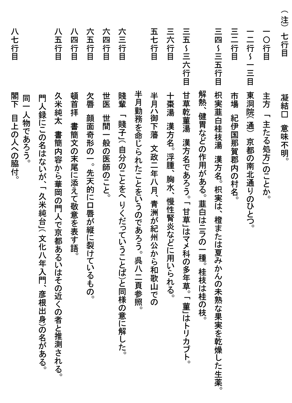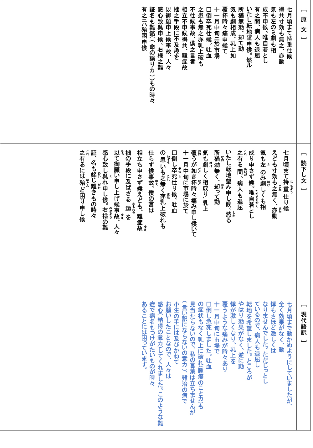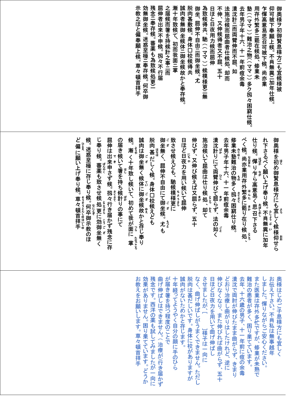 次は水戸藩医である門人が卒業後診察を開始しているが、10年程前の幼児時の病気の予後が悪い人が患者で来たがどのように治療したらよいかとの青洲への相談をご紹介します。