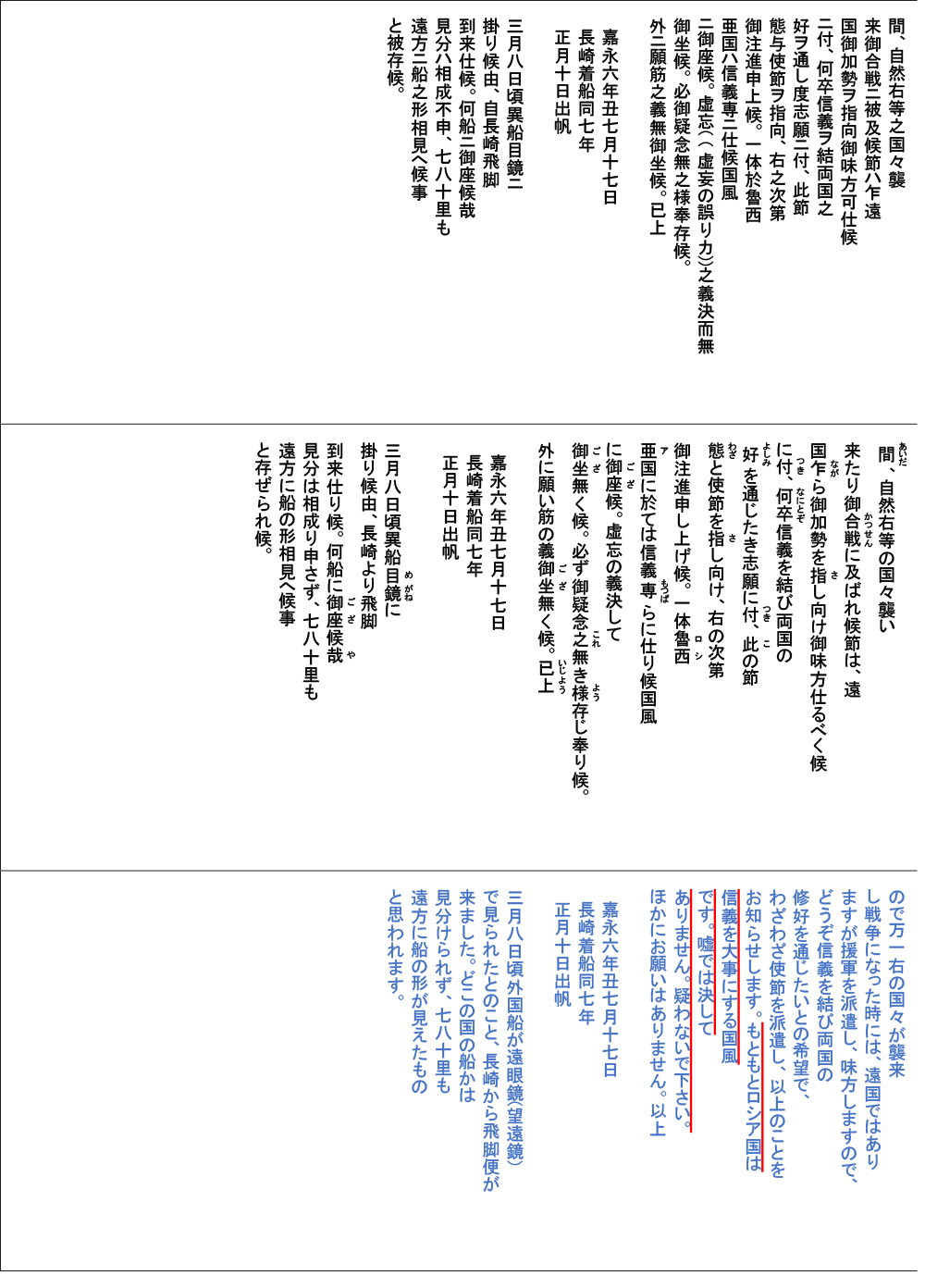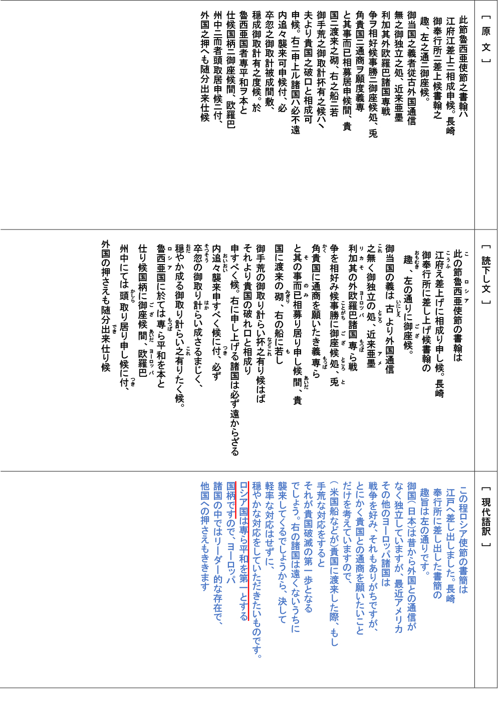 ロシア使節の書簡中、筆者が記した赤色の棒線部分は、2022年2月24日にウクライナに侵攻したロシアが起こした戦争が、この回の草稿を執筆している現在、1ケ月を過ぎた4月になっても終結しない状況を目の当たりにして、勝手に時代を現代に重ねあわせ、