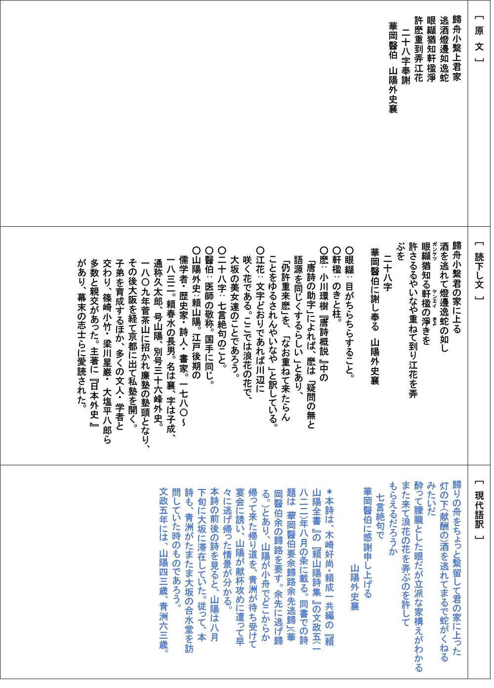 次は全22巻の日本外史を著し、幕末から明治維新・昭和の世界大戦まで広く影響を与えた頼 山陽(注2)の書です。詩の内容からすると、青洲と一献傾けたが山陽が先に酔って帰り、そのお詫びに後日贈ったものでしょうか。