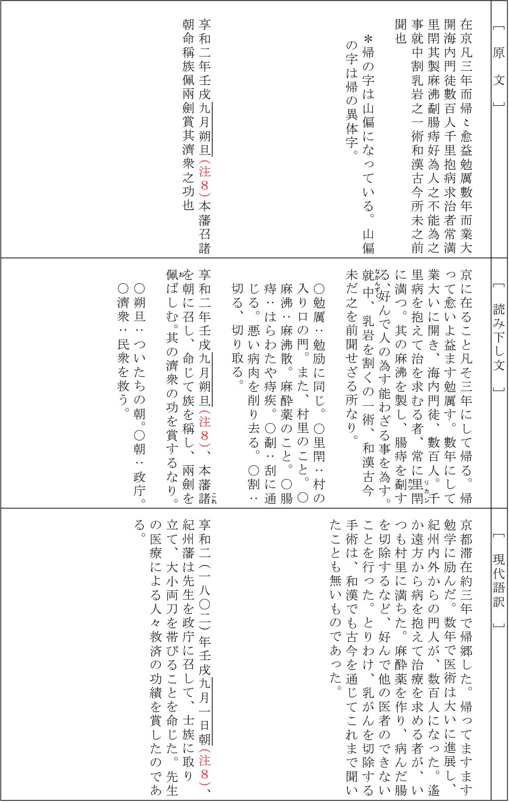 更に先祖から伝わる話を父貞次郎(六代隨賢)から聞いた話として七代隨賢である雄太郎が日本医事新報1521号(昭和28年6月20日発行)に『華岡青洲を語る』と題して寄稿していますのでそこから引用します。