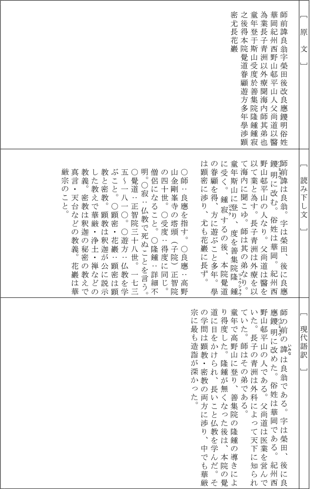 注4-1: のち高野山正智院40代住職となった。(正智院の先代39代は乗如法印といい高野山真言宗358世の管長になった。)今般高野山正智院から栄傳改め良應の掛け軸の写真を送っていただいたのでその画讃の釈文を記す。(青洲と顔立ちがよく似ている。)