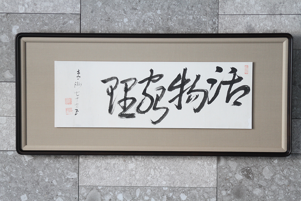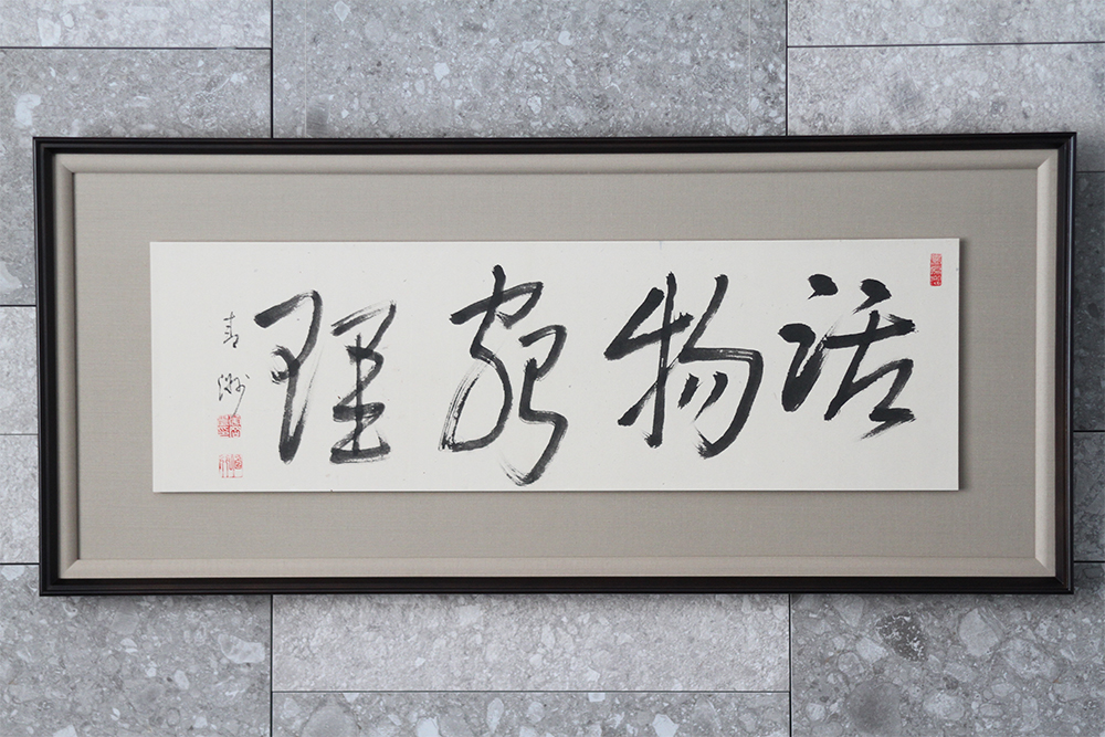 《活物窮理》の扁額(右は青洲75歳時の書、76歳で青洲は没しているので恐らく青洲最後の「活物窮理」の書であろう。筆者の感想としては、少し曲がってしまっているところが、かえって味のある作品に見えるが如何…)