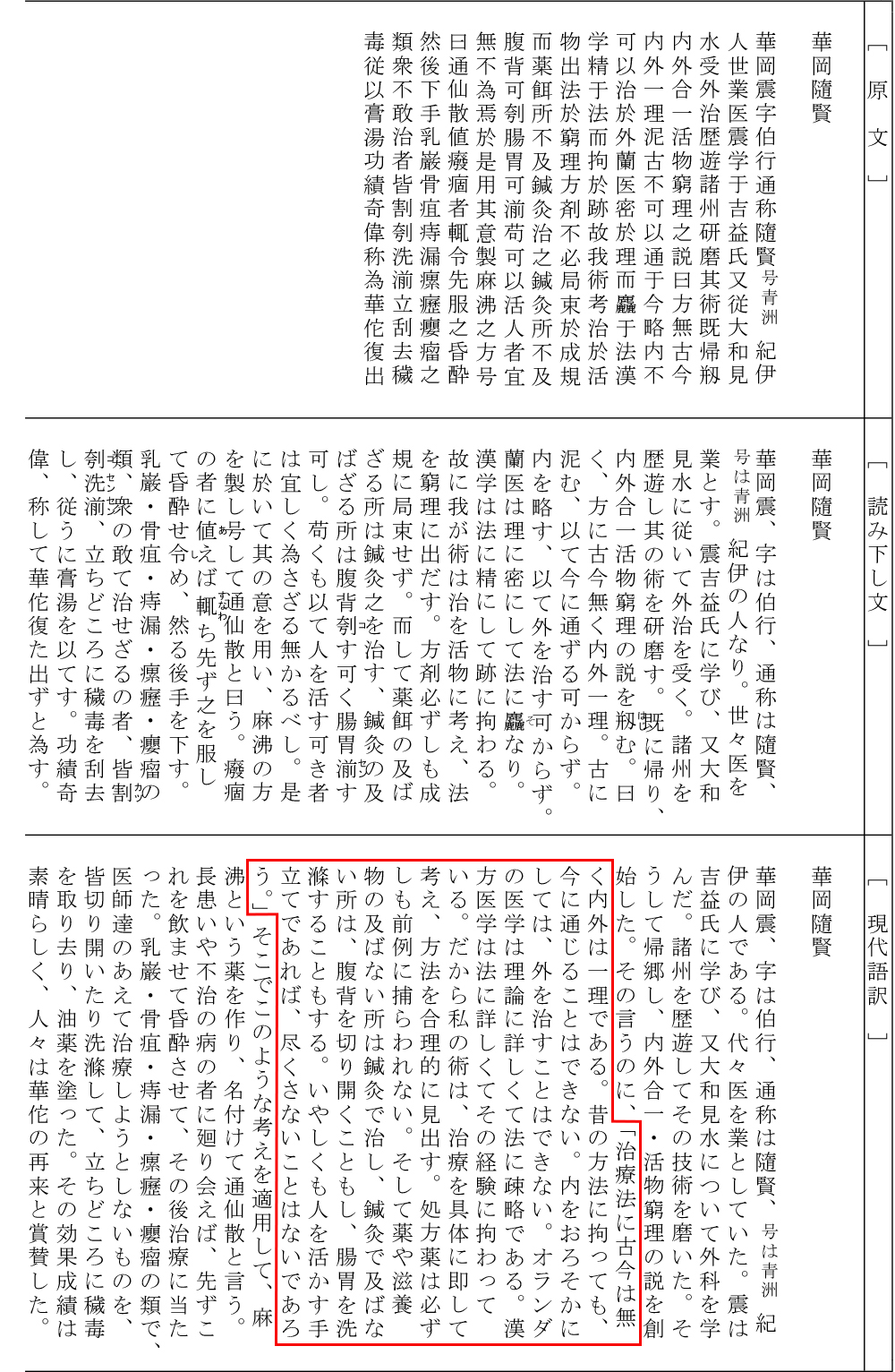 前回紹介した浅田宗伯の「皇国名医伝」の華岡青洲の項目の全文を記す。その中の青洲が述べたというところは赤線で示している。