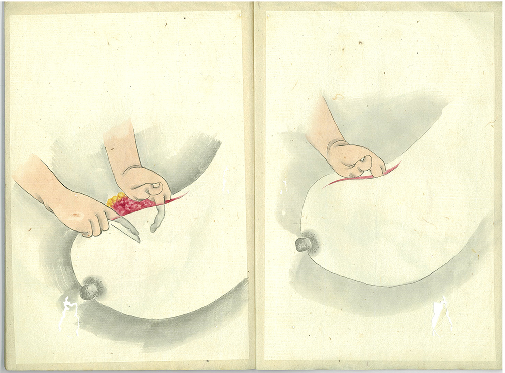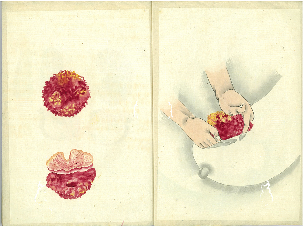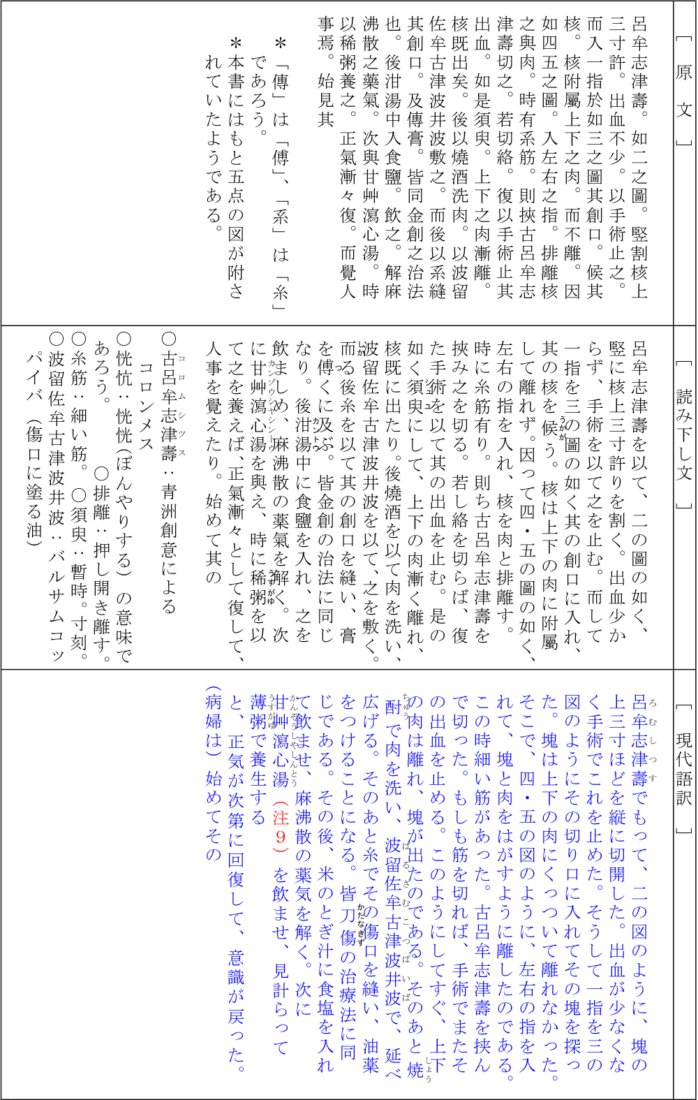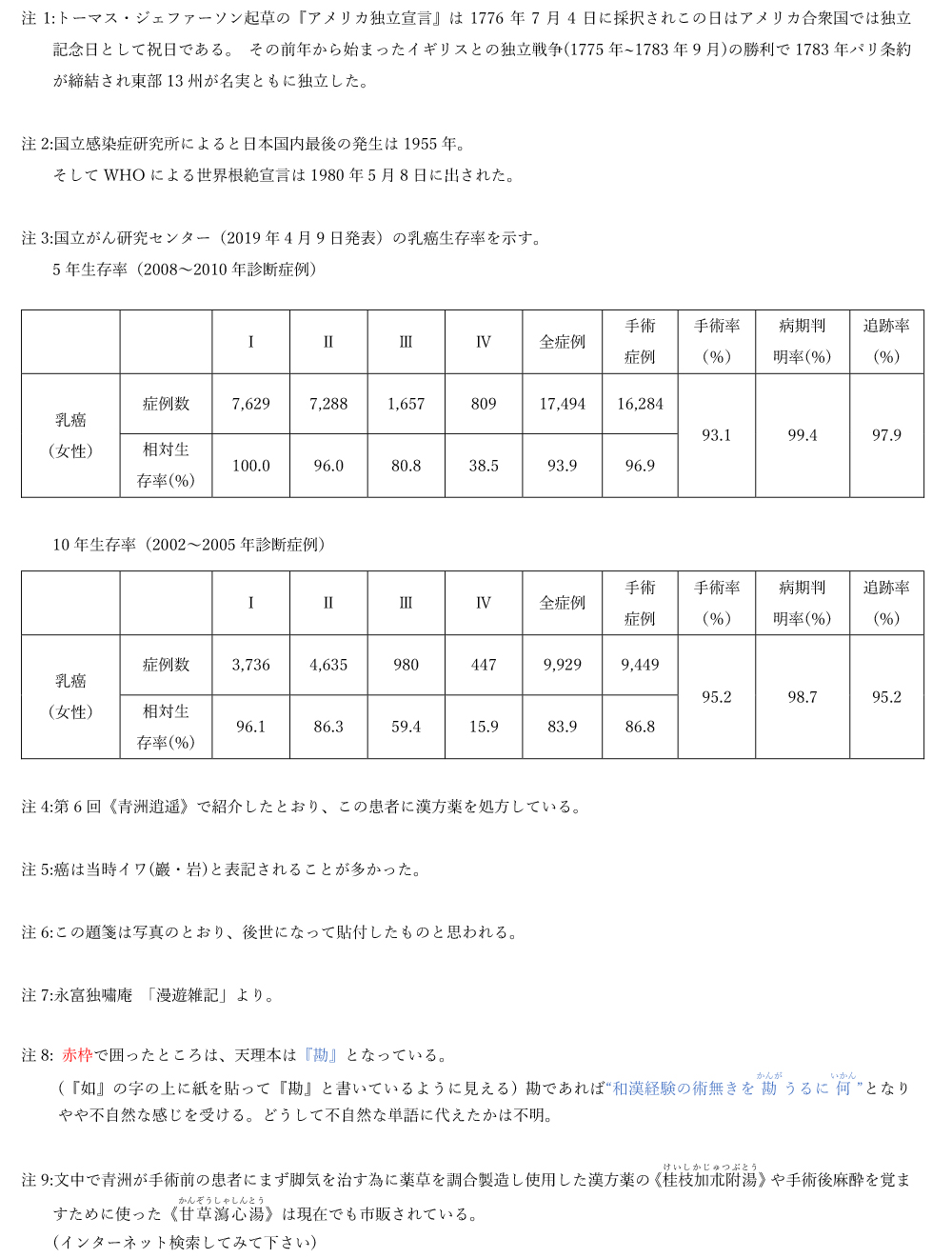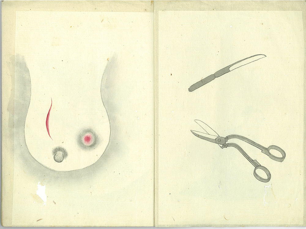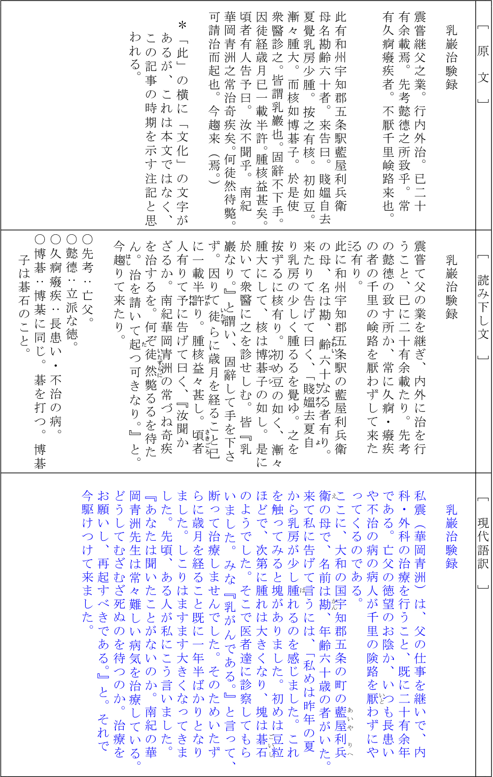 今回は217年前の1804年秋に患者が悲壮な覚悟をして青洲の元を訪れ、切々と青洲に手術を実行するように懇願する様子、そして医師青洲が全身麻酔下乳癌切除手術を決断するまでの揺れ動く心境と、一旦決意した後は漢方医学による内科的治療を施した(注4)後に行なった外科手術の仔細を克明に描いてある本家所蔵の『乳巖治験録』(注5)筆写コピーを元に紹介します。又同治験録文中の第1図~第5図及び“コロンメス”“取り除いた塊”は同じく本家所蔵の『乳癌治験図』(注6)をご覧いただきます。